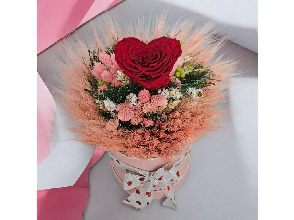 HEART BOX PINK je krásny box so sušených kvetov a živej stabilizovanej ružičky v tvare srdiečka. Ruža prešli procesom stabilizácie vďaka čomu má výdrž niekoľko rokov. Stabilizácia dodáva ružiam dlhú životnosť vďaka čomu si ich krásu môžete vychutnávať niekoľko rokov. Ružičky netreba polievať.