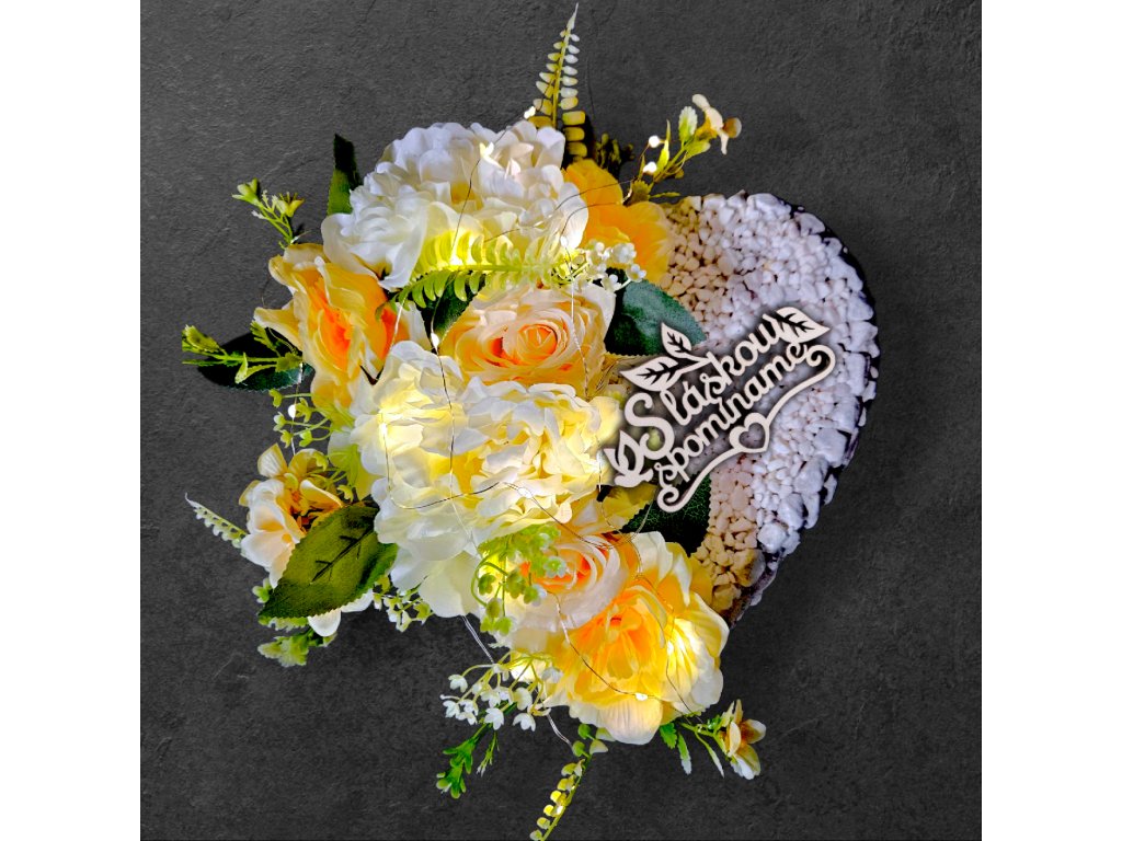 Betónové zaťažené srdiečko na hrob v žltej farbe s LED osvetlením a nápisom. Rozmer cca 38x30cm.
