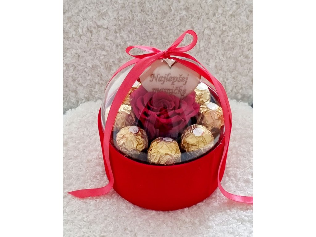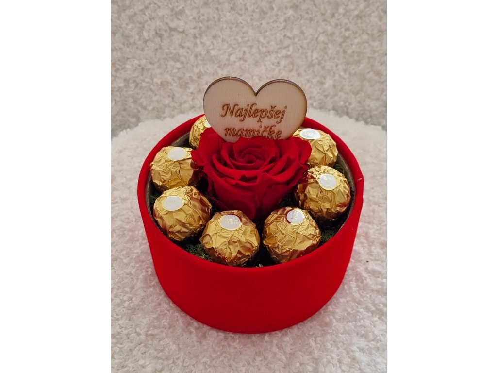Krásny box so živou ružičkou, stabilizovaným machom a Pralinkami Ferrero Rocher.
