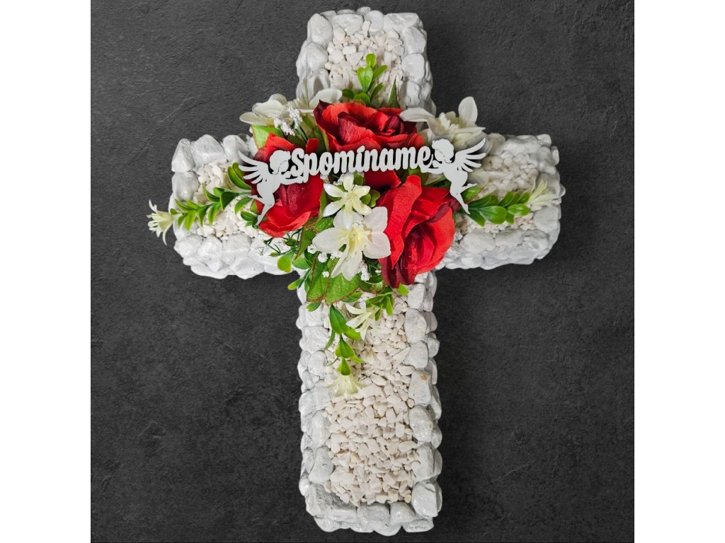Veľký betónový kríž na hrob v červenej farbe s nápisom. Rozmer cca 40x30cm.