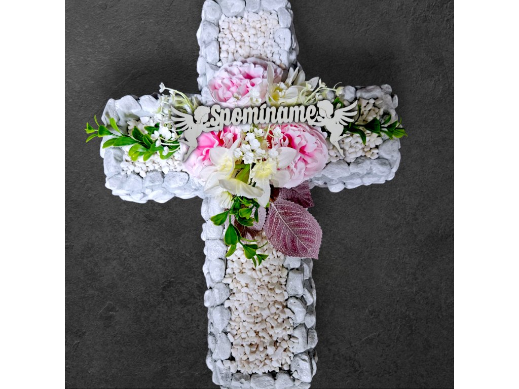 Veľký betónový kríž na hrob v rúžovej farbe s nápisom. Rozmer cca 40x30cm.